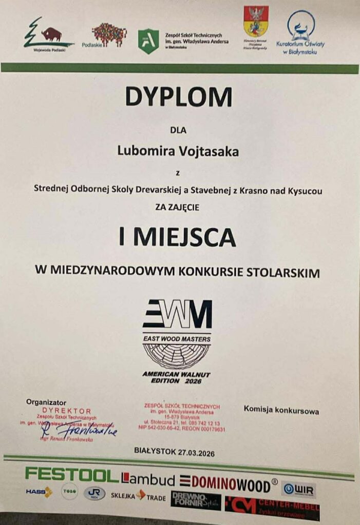 V dňoch 25. – 27. marca 2026 sa žiaci tretieho ročníka študijného odboru stolár zúčastnili prestížnej medzinárodnej súťaže zručnosti EAST WOOD MASTERS 2026, ktorá sa konala v poľskom meste Białystok.